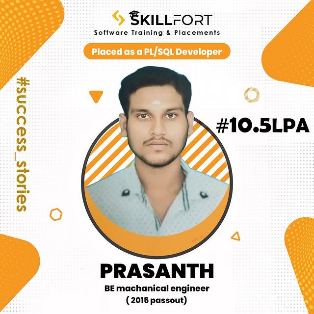 We are proud to announce that our student *PRASANTH* has been successfully placed with a package of *βΉ10.5 Lakhs* per annum as a *PLSQL DEVELOPER* ππΌ