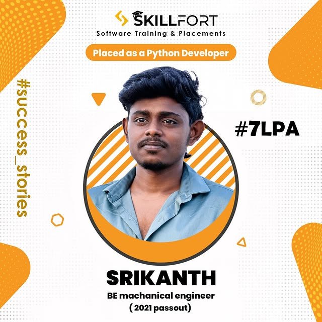 We are proud to announce that our student *SRIKANTH* has been successfully placed with a package of *βΉ7Lakhs* per annum as a *PYTHON DEVELOPER* ππΌ