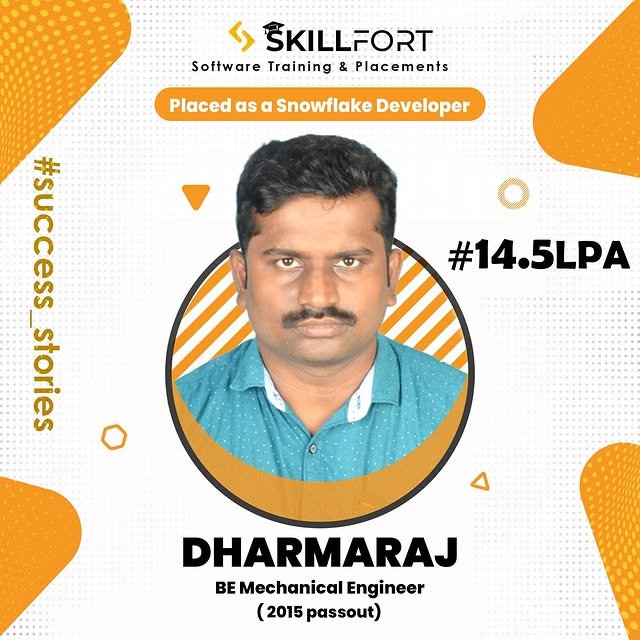 We are proud to announce that our student *DHARMARAJ* has been successfully placed with a package of *βΉ14.5 Lakhs* per annum as a *Snowflake Developer* ππΌ